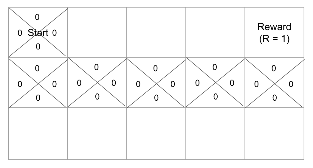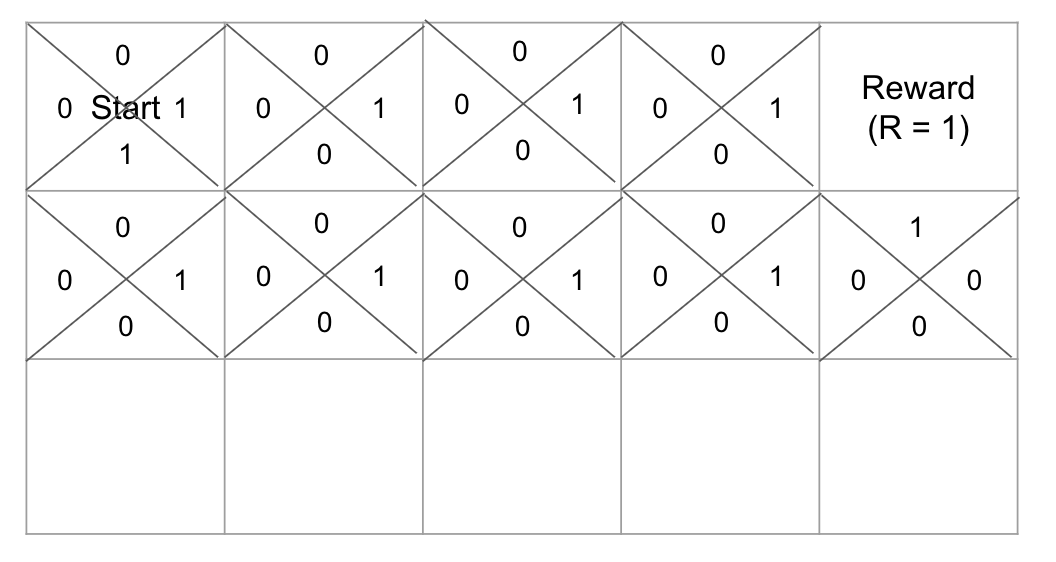 자, 그러면 여기서 발생하는 문제는 또 무엇일까요? Greedy한 선택으로 업데이트를 진행했기 때문에 어디가 최적의 경로인지를 알 수가 없습니다. 그렇다면 이를 알기위한 값이 필요하겠죠? 그게 바로 감마(γ)입니다. γ값은 0에서 1사이의 값을 갖는 값으로 목적지에서 부터 출발지점까지의 경로의 타일이 움직일때마다 값이 곱해지게 되는데 다음과 같이 타일이 업데이트 됩니다. (현재 경로는 첫번째 열에서 단방향, 위 그림에서 봤던 'ㄴ'자형 경로 두 가지의 경로를 찾았음을 가정합니다.)