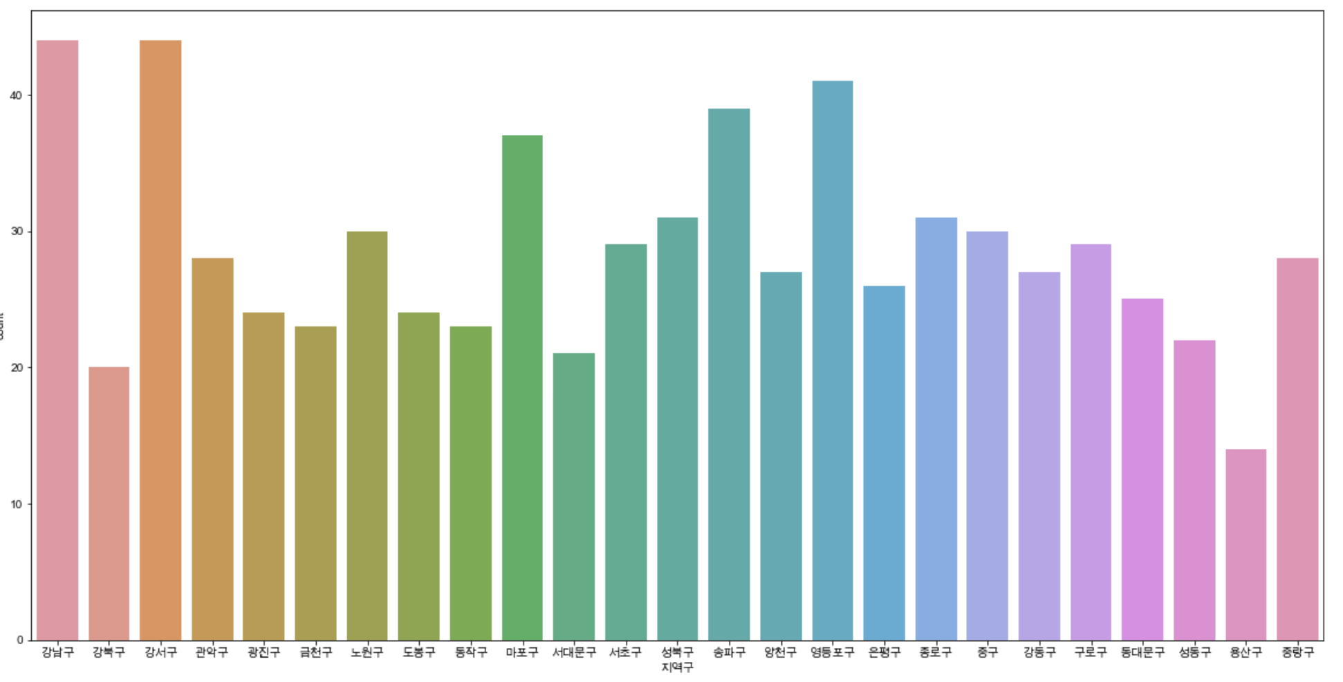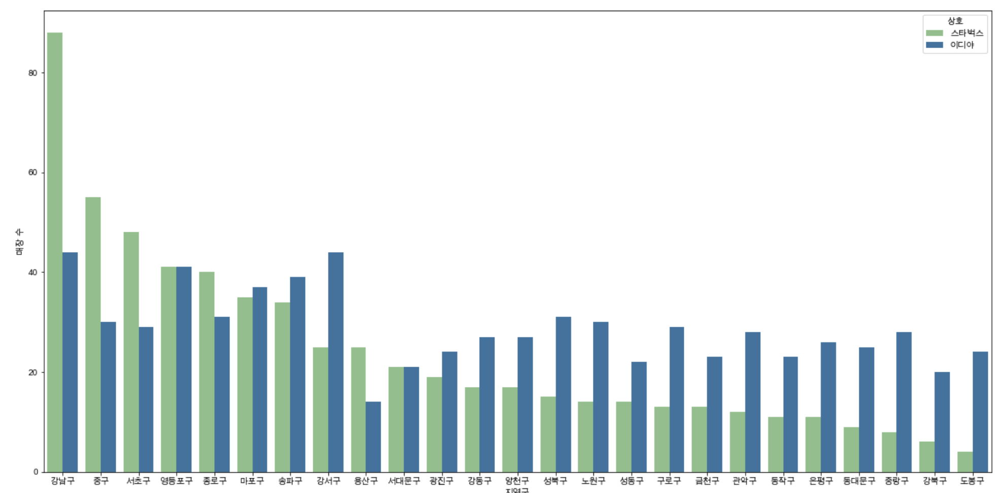 - 처음 데이터에서 확인했듯 이디야의 점포가 200개 더 많았던 점을 고려하면 단순히 '이디야 매장이 많아서 근처에 스타벅스가 있을 뿐'일 수 있기 때문에 예외의 상황이 있는지 확인해보기 위해 지역구별로 스타벅스와 이디야 매장의 수를 확인해보기로 함.