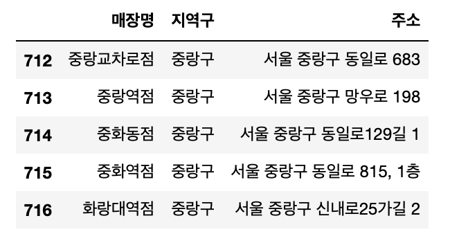 - 각 브랜드의 매장이 많은 순서대로 정렬해보니 각각 1개의 지역구를 제외하고 공통된 지역구로 나타났다. 공통된 지역구에 입점률 하위 그룹인 강서와 송파가 위치해 있었다.
