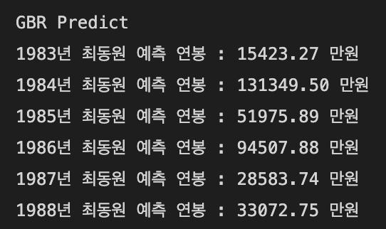 print("{}년 최동원 예측 연봉 : {:.2f} 만원" .format(target_data['year'].iloc[i], gbr_target_pred[i][0]))