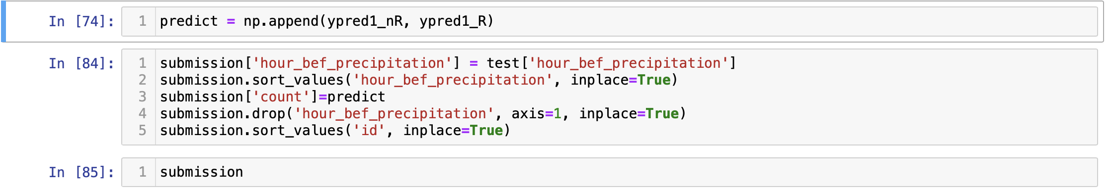 : 우천 여부에 따른 데이터로 훈련을 시켰지만 우천 여부가 나와있는 테스트 데이터에 각각 전부 적용해버렸다. 사실 이 부분을 결정하면서 고민이 많았다. 어찌됐든 예측하는건데 비가 올경우의 대여수량 예측인거고 비가 안올때 대여수량 예측이니 그대로 해도 되겠지와 훈련시킨 데이터가 너무 다른데 이러면 Underfitting(과소적합) 현상이 나타날 것 같았다.(확인은 안해봤지만 실제로 비우천인데 우천으로 예상한 결과는 무조건 이 현상이 있을 듯...) 그럼 테스트 데이터도 훈련 데이터처럼 구분을 시키고 각각의 훈련데이터로 예측을 하고 합칠까 생각이 들었다. 그 과정이