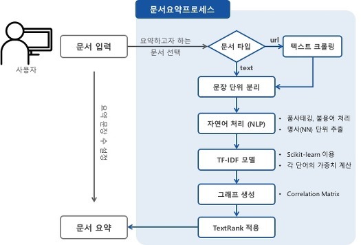 텍스트랭크를 탄생시켜준 페이지랭크에 대해서 알아봤으니 이제 텍스트랭크에 대해서 알아보겠습니다. 페이지랭크에서는 웹사이트에 존재하는 많은 페이지간 사이트들 간의 관계에 중점을 두었습니다. 텍스트 랭크는 문서 하나를 하나의 웹 세상으로 보는 것입니다. 그렇게 된다면 문서를 구성하는 문장들이 존재하는데 이 문장들이 하나의 웹사이트가 되는것이죠. 그러면 각 문장들간의 관계가 존재할 것입니다. 이를 통해 문서에서 문장들의 점수가 할당이 될 것이고 이를 나열하여 문서를 대표할 수 있는 문장들을 추출해내는 것이죠. 이게 문서 요약 방법 중 하나인 추출적 요약(extractive summarization)에 해당합니다. 문서를 문장 단위로 분리하고 이를 전처리 작업을 진행하여 문장을 하나의 임베딩 벡터로 만듭니다. 여기서 임베딩 벡터로 만드는 방법은 사용자가 다양하게 결정할 수 있습니다. 훈련된 임베딩 정보를 가져와 적용할 수 있고 직접 임베딩을 처음부터 구현할 수 있습니다. 데이터셋에 맞는 훈련된 임베딩이 있다면 불러와 사용하는게 자원적으로 가장 좋은 방법입니다. 이후 문장의 임베딩 벡터들을 활용해 그래프(Martix)를 만들어내고 TextRank를 적용하면 문서의 요약 문장을 만들어 낼 수 있습니다. 글로 설명하면 어려울 수 있으니 프로세스는 아래 그림을 참고하시면 됩니다.