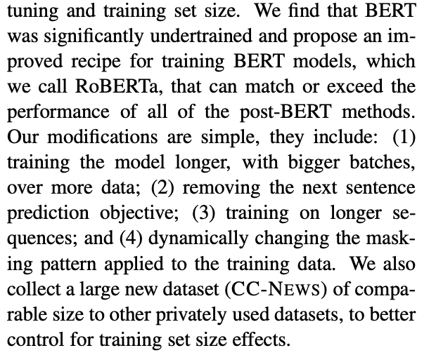 RoBERTa가 등장한 배경에 대해서 설명합니다. Abstract에서 이야기했듯 BERT가 undertrained된 것을 발견하고 이를 향상시키기 위해 기존 버트와 다른 4개의 다른점을 소개하고 있습니다. 그 내용이 담긴 소개문의 일부를 발췌하였습니다.