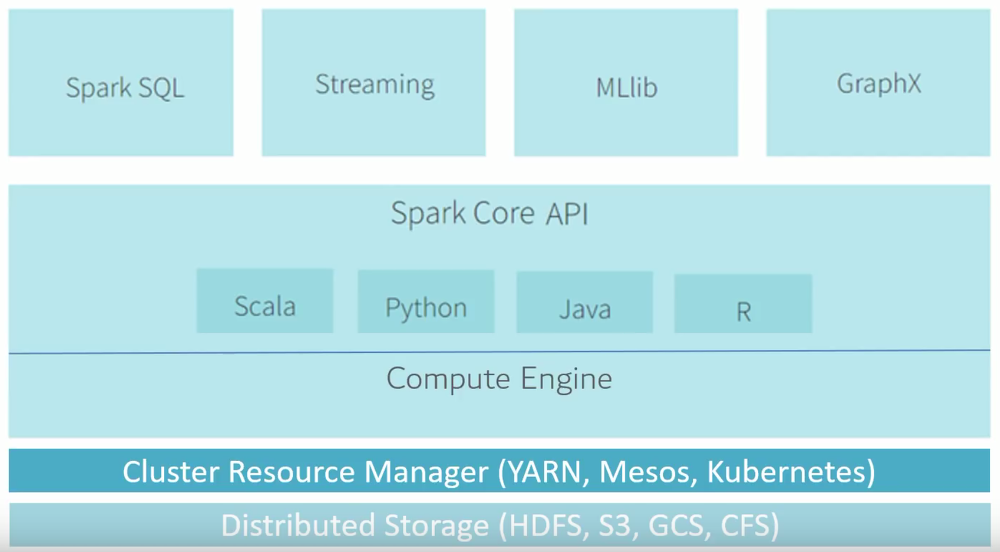 그런데 Apcahe Spark는 하둡과 경쟁하지 않고 협력하는 구조가 되었고 하둡의 YARN 위에 Spark를 올려 사용하는 형태가 되어 실시간성이 중요한 데이터의 경우 Spark로 처리하는 구조가 되었다고 합니다. 아래 그림을 통해 보시면 알 수 있듯 Spark는 Scala, Python, Java, R 다양한 프로그래밍 툴에서 사용할 수 있습니다. 즉 Spark의 Core API중에서 Python을 통해 Spark를 작동시키는 것이 Pyspark입니다.
